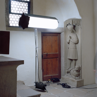 Drehpause: Die eigentlichen Akteure dieser Szenerie - Strahler, Reflektorschirme und Stative - stehen dicht gedrängt, Seite an Seite, in prunkvollen Sälen und scheinen verschwörerisch die Köpfe zusammengesteckt zu haben. In der Serie French Flags, Butterflies & Bazookas zeigt Malte Sänger, was sonst im Verborgenen bleibt und gewährt sprichwörtlich einen Blick hinter die Kulissen: Er fotografiert Werkzeuge des Films und dokumentiert damit die Akteure des Hintergrunds. Der Titel der Serie ist zudem eine Auflistung verschiedener Filmtools, die dazu dienen, optimale Bild-, Licht und Tonverhältnisse zu schaffen. Das sonst unsichtbare, aufwendige Aushandeln dieser Parameter, das notwendig ist, um ein scheinbares Produkt von Wahrheit – den Dokumentarfilm – zu generieren, wird hier als Moment des Artifiziellen und Inszenierten entlarvt.